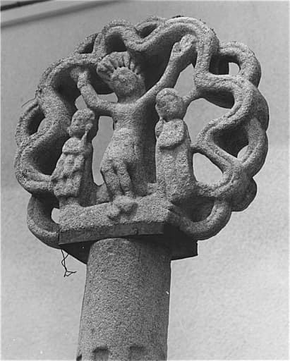 Croix située sur la place de l'église, datant sans doute du 12e siècle. La figure du Christ est couronnée. Il n'y a pas de croix en tant que tel. Celle-ci est représentée par les bras étendus du Christ. Avec la Vierge et Saint-Jean, il est entouré des ondulations d'une circonférence polylobée. Sur l'autre face est sculptée la Vierge tenant l'Enfant. Le fût date du 15e siècle. Le socle a été refait en 1808. Le tout est en granit.