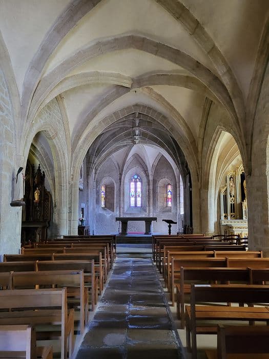 Edifice du 15e siècle dans sa quasi totalité, hormis le petit porche ajouté en 1721. A l'intérieur, la nef centrale et les bas-côtés sont voûtés à liernes et tiercerons. Le clocher en façade est du type des clochers-murs fréquents dans le Cantal. Il est surmonté d'une charpente ancienne et d'un clocheton.