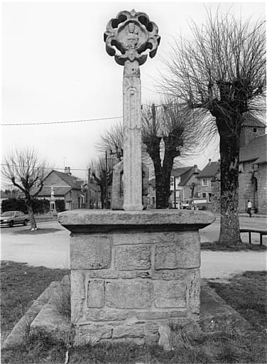 Croix en granit placée sur un socle rectangulaire, lui-même supporté par un escalier à trois marches qui n'entoure pas la face antérieure du socle. La partie supérieure est en forme de médaillon losangé entouré de festons circulaires. Ce médaillon porte, en son centre, en léger relief, un Christ en croix ayant les Saintes femmes debout à ses pieds. Dans le socle, en façade, est encastré un chapiteau représentant le Christ assis, une main sur la poitrine, l'autre posée sur le genou. Derrière lui, à sa droite, un personnage tient un encensoir. A droite du chapiteau, très fruste, un animal dont on ne voit qu'une jambe terminé par un pied portant des griffes et une aile. Au milieu de cette aile se trouve une demi sphère. Entre le Christ et l'aile est gravée une inscription.