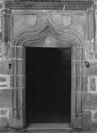Tourelle d'escalier rectangulaire à vis, en pierre, avec porte d'entrée à mouluration du 15e siècle en accolade avec écusson armorié, surmontée de deux fenêtres également moulurées dont une en accolade et l'autre à linteau droit. Cour intérieure fermée par une porte cochère de style Louis XIII.