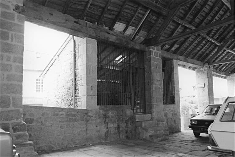 Halle allongée dont l'accès s'effectue, au nord et à l'ouest, par quelques marches en raison de l'inclinaison du terrain. Sur les côtés Est et ouest, six piliers en granit la divisent en cinq travées. Ces piliers cubiques, dont les angles sont abattus d'un chanfrein à congés jusqu'à près des deux tiers de leur hauteur, sont dressés sur des bases en forme de tronc de pyramide, ou présentant des degrés successifs en retrait. Sur les longs côtés, ces bases sont jointes par un mur élevé à hauteur d'appui, échancré d'une ouverture sur chaque face. Ces piliers servent de support à la toiture formée de quatre pans, couverte en ardoises du pays, et dont chacune des deux croupes est surmontée d'un épi en métal. La charpente comprend quatre fermes posées sur les sablières. Sur les trois travées centrales, des pannes reposant sur les arbalétriers portent les chevrons. Les deux travées extrèmes comportent deux tirants horizontaux croisés, joignant une petite pièce transversale établie dans chaque angle.