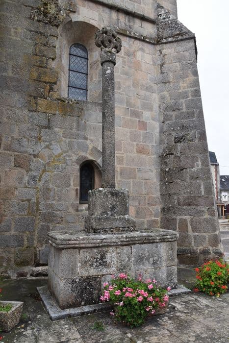 Croix en granit du type des croix antefixes des églises romanes de la région. Placée sur une base formant autel rectangulaire, elle repose sur un socle avec fût cylindrique en deux morceaux. La croix est constituée d'une torsade en passementerie dont les quatre branches égales seraient des touffes de cordelette. En réalité, ce n'est que la déformation d'un type régional de croix inscrite dans un cercle et formée d'entrelacs, d'origine carolingienne.