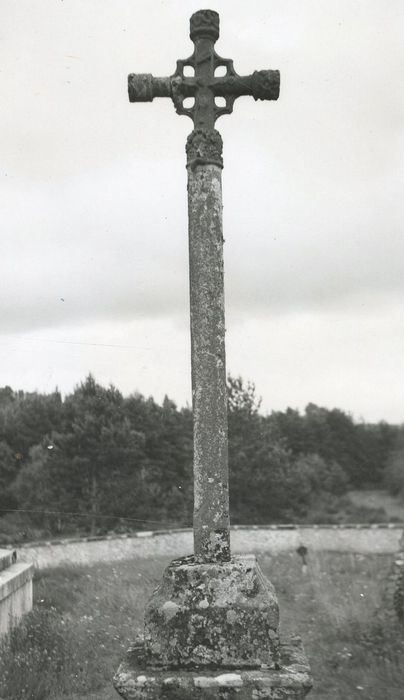 La croix est placée sur un socle cubique terminé par une table carrée aux bords saillants chanfreinés. Sur cette table est posé un socle cubique, en forme de tronc de pyramide dans sa partie supérieure. Sur la plateforme terminale de ce socle est posé le fût circulaire, au-dessus d'une base carrée. Un noeud sépare le fût de la croix. A la base de ce noeud fait saillie une baguette torique. Au-desus règne un décor de feuilles frisées et retournées. Bras et montant ont leurs extrémités également cylindriques, renflées au-dessus d'un tore. Deux de ces cylindres terminaux ont un décor végétal. Bras et montant sont réunis autour du centre de la croix par des redents, formant un nimbe sensiblement carré, ajouré de quatre lobes. Sur une face est représenté le Christ crucifié ; sur la face opposée, la Vierge tenant l'Enfant est représentée debout sur une console prismatique, la tête abritée sous un gâble décoré d'un trèfle.