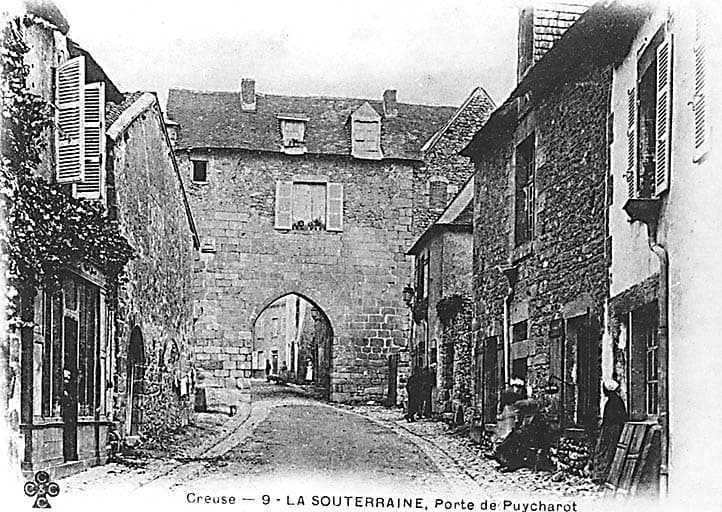 La Souterraine eut plusieurs enceintes successives, élevées au 13e siècle et surhaussées au 15e. La première enceinte date du 12e siècle. Elle fut édifiée par l'abbé de Saint-Martial qui y possédait un monastère. Elle fut rasée en 1207 par Hugues IX de Lusignan, comte de la Marche. Une seconde enceinte fut élevée au 13e siècle, Raimond de Gaucelme, abbé de Saint-Martial, ayant rétabli sur la ville l'autorité du monastère en 1226. Les vestiges feraient partie du tracé du 13e siècle. Ils forment actuellement un mur de terrasse entre deux niveaux de jardin. Deux portes sont conservées : la porte Saint-Jean et la porte de Puy-Charraud 14e siècle ?). Cette dernière, construite en granit, se compose d'un passage à rez-de-chaussée entre deux piédroits dont l'un contient un escalier en colimaçon accédant à un ancien corps de garde. Le passage est voûté en berceau surbaissé et se fermait par une porte à cintre brisé garnie d'une herse.