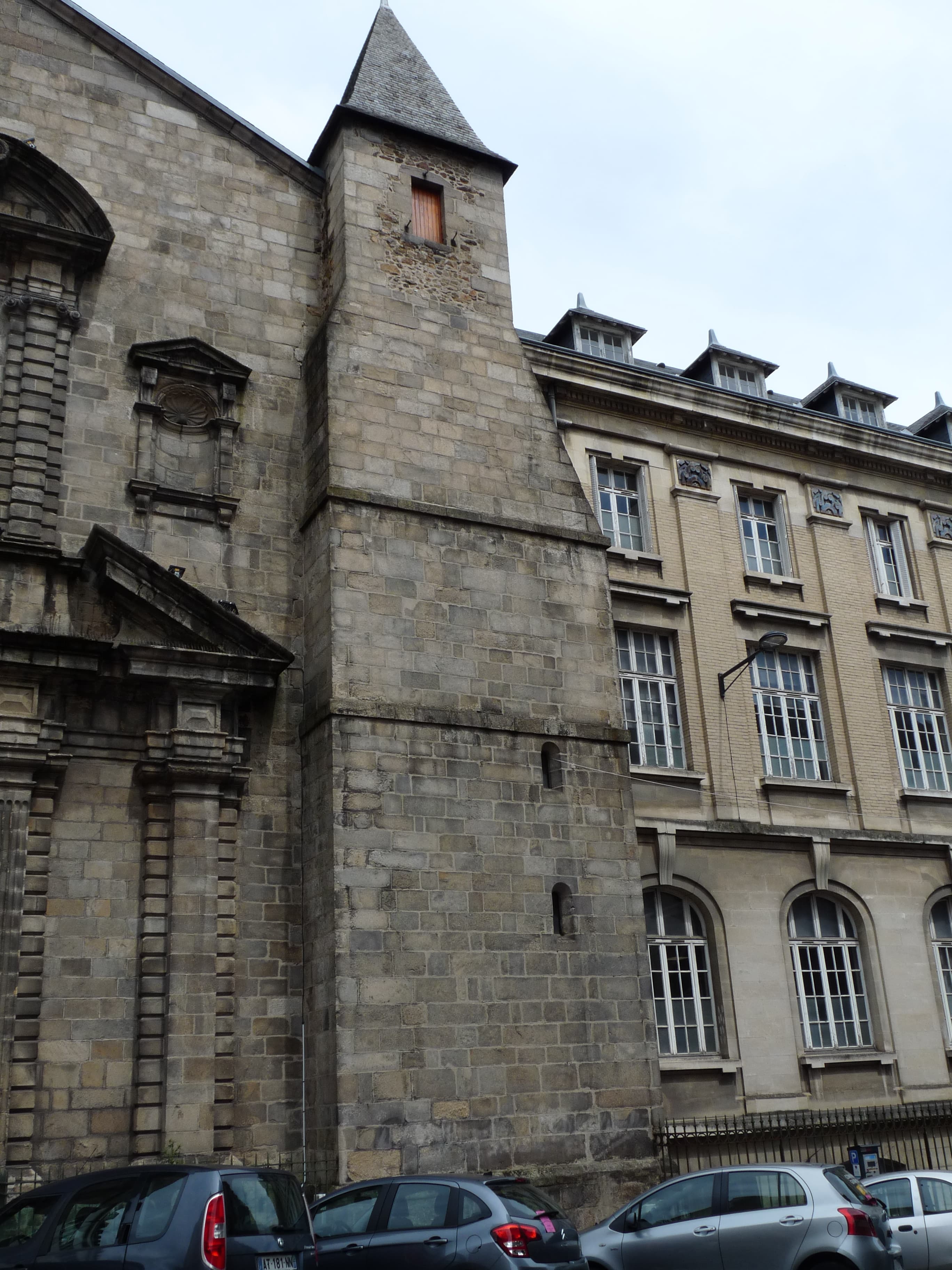 Les bâtiments du 17e siècle (datés 1621) ont été détruits en 1964 ; le portail (daté 1685) a alors été démonté, puis remonté en 1967 dans le pignon du réfectoire de l'actuel lycée. L'entrée en anse de panier à moulure torique est encadrée de deux pilastres à chapiteau corinthien avec contre-pilastres. Cet ensemble supporte un entablement portant deux vases placés dans l'axe des pilastres. La clef de voûte est constituée par un cartouche aux armes de France embrassant l'ensemble de l'entablement et dont le sommet forme un socle polygonal avec base décorée de feuilles d'acanthe. Une sorte d'attique sert de couronnement au portail. Deux petits pilastres surmontés de vase à flamme encadrent le fond et sont reliés par une corniche en plein cintre, dont le tympan contient un second cartouche portant un mascaron en chef et, en pointe, l'emblème de la compagnie de Jésus.