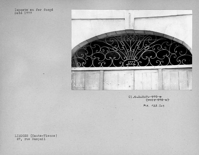 L'imposte en fer forgé (cad. EH 185) : inscription par arrêté du 3 octobre 1946