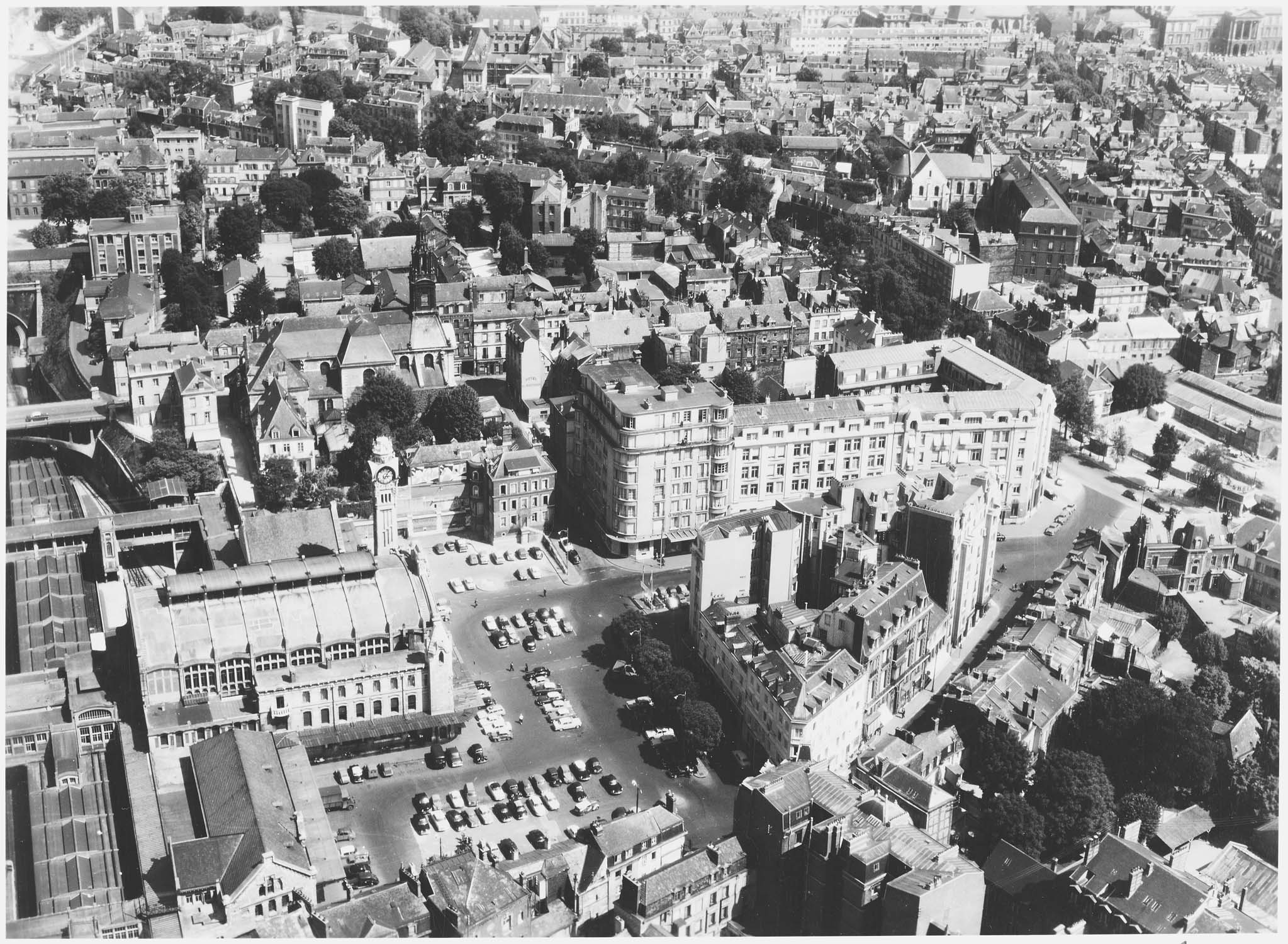 La première gare de Rouen date de 1850. La gare actuelle est construite à partir de 1914 et achevée en 1928. Son dessin, dans un style Art Nouveau tardif, est dû à l'architecte A. Dervaux, la structure en béton armé étant étudiée par le bureau Considère, Pelnard et Caquot. Les passerelles et galeries de circulation ont été modifiées lors d'une restructuration de l'édifice en 1985, destinée à créer un parc de stationnement au-dessus des voies.