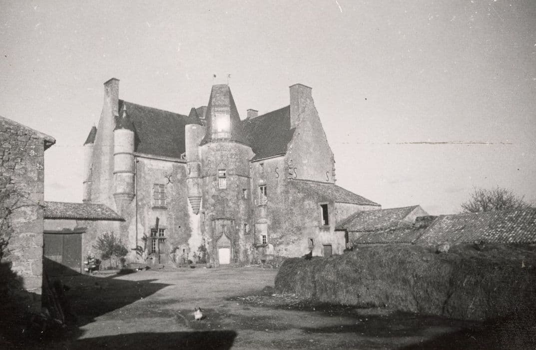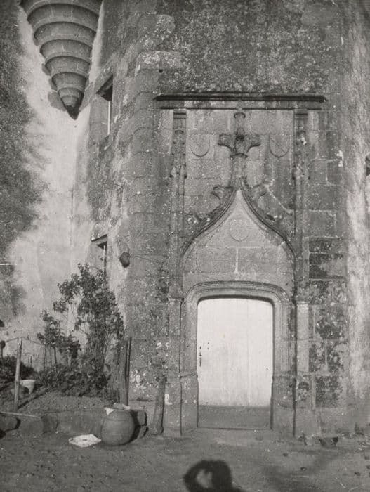 Corps de logis central à trois pans. Partie inférieure percée d'une porte en arc surbaissé, décorée d'une accolade à choux frisés et fleuron terminal. Deux pinacles à la naissance de l'accolade. Fenêtre supérieure également décorée d'une accolade, surmontée d'un écu sculpté. Deux tourelles en encorbellement et surmontées d'une toiture en pavillon, flanquaient le départ d'une aile disparue.