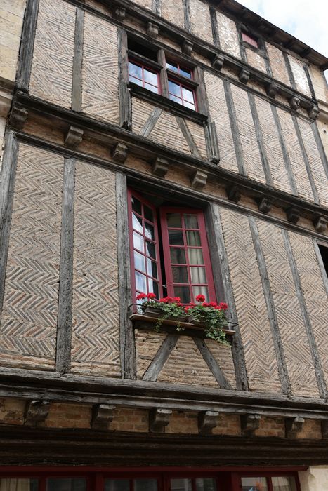 Cette maison est restée telle quelle depuis le 15e siècle et présente deux étages en surplomb sur têtes de poutres saillantes. Pans de bois et remplissage en briques disposées de manière à dessiner des losanges. Les fenêtres ont conservé leur encadrement de bois. C'est un type de maison très caractéristique de la région pour le 15e siècle.