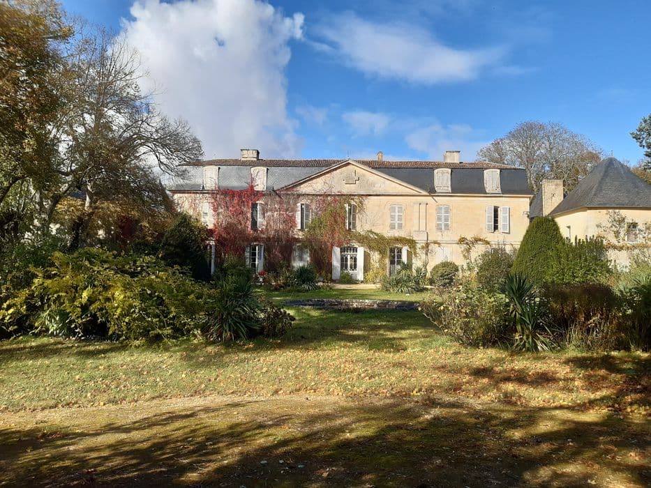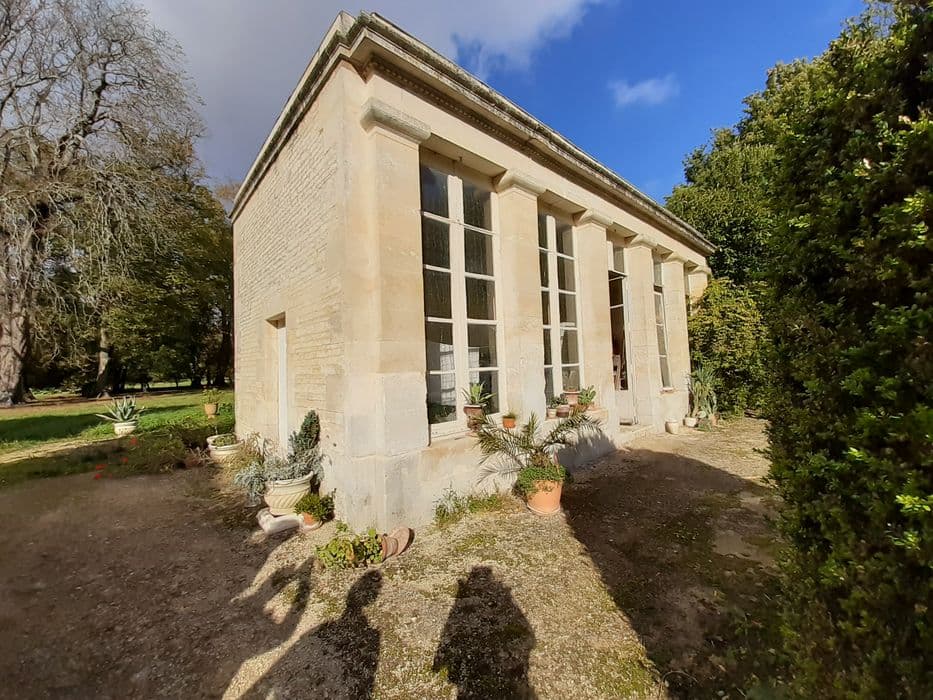Domaine situé sur une ancienne ligne frontalière entre le Poitou et la Saintonge. Il s'agit d'un très ancien site stratégique, peut-être dès l'époque romaine, mais sûrement au Moyen-âge comme l'atteste la motte présente dans le parc. Le fief de Lens est nommé dans une charte dès 936. Le château, construit vers le milieu du 18e siècle, présente une architecture classique avec ses pavillons d'angle carrés et ses façades principales à fronton, parfaitement symétriques. L'intérieur semble avoir été réaménagé au 19e siècle (papier peint à "chinoiseries", cheminées pour poële...). Ce logis est implanté dans un quadrilatère sceint par endroit de douves, qui contient également les communs dont un rare moulin du 18e siècle, le parc et les jardins. Autour du château, ces derniers sont à la française. L'organisation s'effectue selon douze carrés et se matérialise par des allées se coupant à angle droit. Plus au nord se trouvent l'ancienne charmille et le parc à l'anglaise. Cette composition est attestée au 19e siècle mais remonte probablement au 18e siècle, du moins en partie.