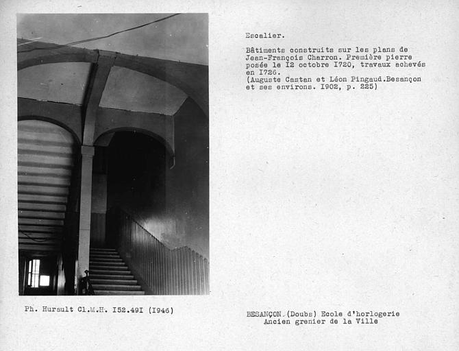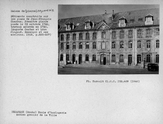 Facade et toiture de l'école d'Horlogerie (sur la place de la Révolution) au 27 rue des Boucheries : inscription par arrêté du 28 juin 1929 ; Façade et toiture, ainsi que la chaussée et le quai (quai Vauban) : inscription par arrêté du 16 septembre 1933 ; Les parties suivantes de l’enceinte urbaine : les vestiges enfouis de la contrescarpe de la tour bastionnée de Rivotte situés sur la parcelle 58 (section DK), les vestiges du rempart, même ceux enfouis, entre la tour bastionnée de la Rivotte et la tour bastionnée de Brégille, situés sur la parcelle n°11 (section AK), la partie du rempart entre le bastion du moulin Saint-Paul et les vestiges de la tour bastionnée Saint-Pierre, située 22 avenur Arthur-Gaulard, sur les parcelles n°16 et 67 (section AH), les vestiges de la tour bastionnée Saint-Pierre située rue Elisée Cusenier, sur la parcelle n°29 (section AE), les vestiges enfouis de la lunette de Bregille, situé sur la parcelle n°109 (section CX), le corps de garde est de Chamars du XVIIIe siècle, situé 2 avenue de la Gare d’Eau, sur la parcelle n°36 (section AR), l’ensemble des vestiges enfouis de la seconde ligne de remparts situés sous l’hôpital Saint-Jacques, sur la parcelle n°5 (section AV), 2 avenue de la Gare d’eau, parking du Département Doubs, 4 et 6 avenue de la Gare d’eau, sur les parcelles n°35, 44, 48 et 73 (section AR), le corps de garde nors de la porte d’Arènes, situé sur la parcelle n°164 (section AX), tels que délimités en rouge sur le plan annexé à l’arrêté : inscription par arrêté du 10 septembre 2019