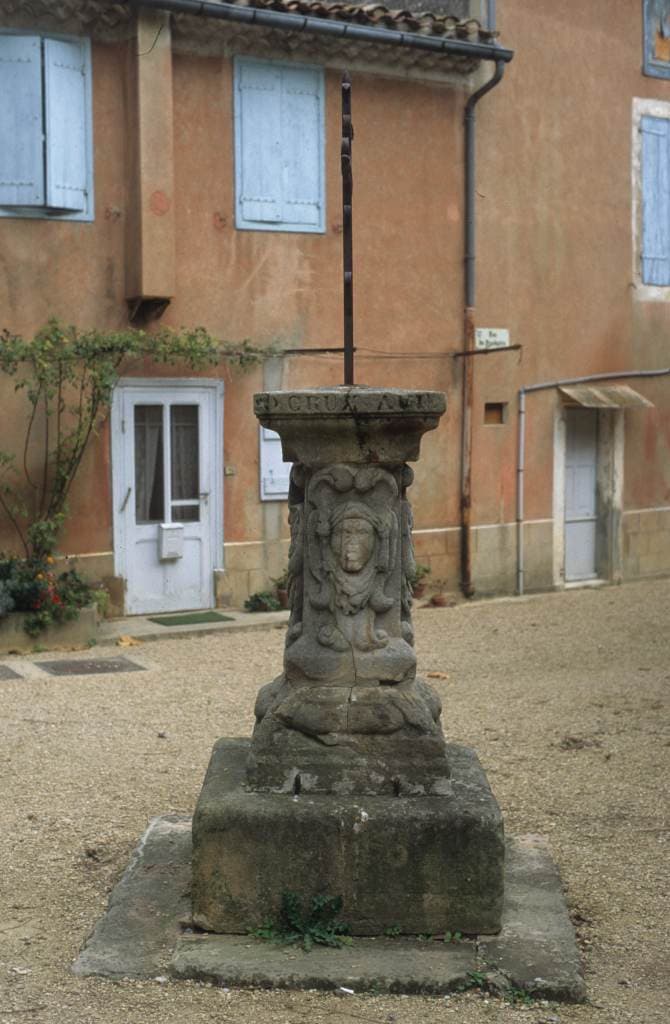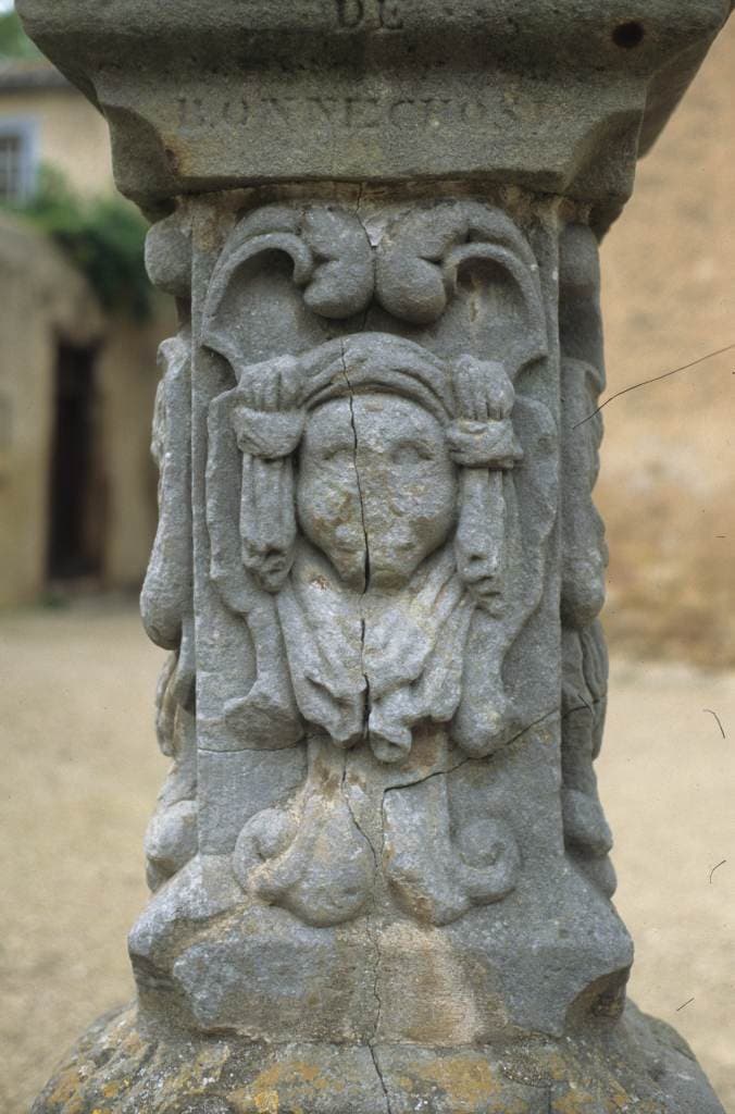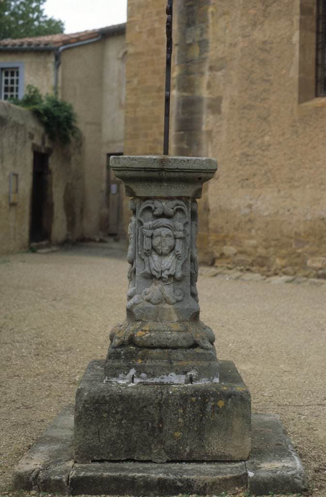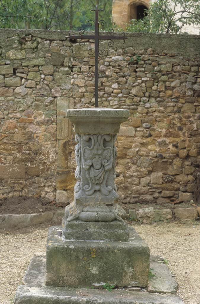 La croix est récente. La partie médiane du socle était constituée par une pierre de remploi sculptée, en grès, de provenance inconnue. Les quatre faces du pilier sont sculptées d'une tête ou d'un masque qui forme le centre d'un cartouche au découpage compliqué dont les bords se retournent en épaisses volutes. Le tout est lourdement chargé d'ornements baroques, de linges, de cordelières, toujours disposés suivant une rigide symétrie axiale.