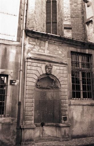 En 1781, des infiltrations s'étant produites dans les murs du chevet de l'église Saint-Michel, il fut décidé de démonter la fontaine et de la reconstruire en laissant un léger espace entre elle et le mur de l'église contre lequel elle était placée. L'ouvrage se présente sous forme d'une niche demi-circulaire. L'ornementation extérieure à la niche est essentiellement constituée par les refends des pilastres et les crossettes des claveaux. Les uns et les autres sont purement ornementaux et ne correspondent pas aux joints réels. Les bases des pilastres sont ornées de tableaux nus. La clef est couronnée par une grande tête sculptée, couronnée de feuillages et barbue. Dans la niche se trouve une grande coquille. Les parements concaves du fond de la niche sont ornés de vermiculures à la pointe.