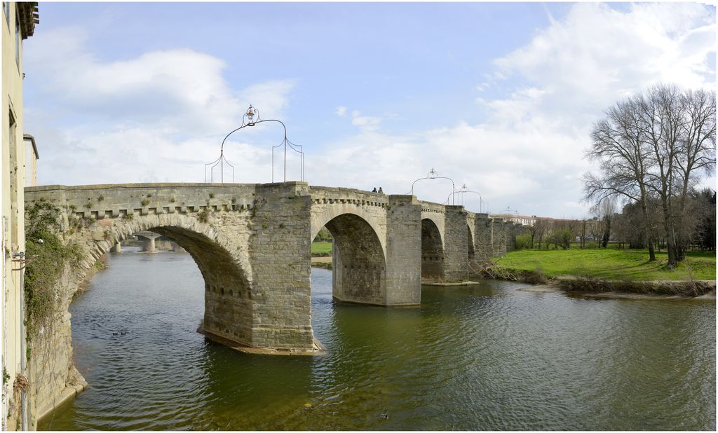Le pont relie la Ville Haute (cité) et la Ville Basse. Au Moyen Age, il était l'unique passage pour accéder à la Cité. Le plus ancien document qui le concerne remonte à 1184. Il fut probablement réparé au 14e siècle. Il se compose de douze arches plein cintre d'inégale longueur s'appuyant sur des piles munies d'avant et d'arrière-becs à éperons aigus. Des refuges sont établis sur les becs. Sur la troisième pile du côté de la Ville Basse s'élevait un mur ouvert d'une porte en plein cintre, séparant la Ville Basse de la Ville Haute. Le mur était couvert pa un double chaperon horizontal, surmonté d'une croix qui, lors de la démolition de la porte, a remplacé, sur le fût dressé dans le troisième arrière-bec, la croix primitive abattue sans doute pendant les guerres de Religion. La partie du mur surmontant l'arc de la porte portait un autre arc dans le vide duquel se trouvaient trois statues.