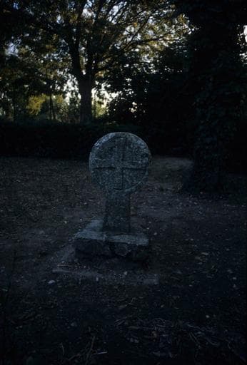 Monolithe de 1,50m de hauteur, implanté dans un socle cylindrique. Le fût, à pans coupés, est à section octogonale presque régulière. Les évidements qui séparent les bras de la croix sont en forme de lancettes. Dans un quatrefeuilles est sculpté en réserve un agneau pascal passant à senestre, soutenant de son pied droit relevé en arrière, une croix hastée et oriflammée. Les parties vues de la hampe, en-dessous et en-dessus du corps de l'agneau, ne sont pas exactement en prolongement. Cette disposition serait une indication, dans la région, de la fin du 13e siècle.