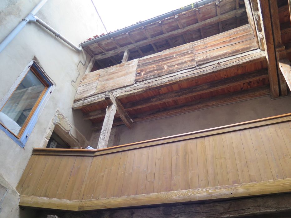 L'immeuble a toujours appartenu à des notables depuis le 16e siècle. La façade a été entièrement remaniée au 19e siècle. L'entrée principale, sur la place de l'église, donne accès, par un couloir, à une petite cour avec puits à niche et margelle de pierre. Cette cour est entourée de galeries superposées en bois, sur deux côtés. L'escalier qui dessert ces galeries est aussi en bois. Les deux extrémités de la galerie nord s'ouvrent sur les appartements par des portes en accolade. Les appartements du premier étage, au nord et à l'ouest de la cour, ont conservé en grande partie leurs anciens plafonds à poutrelles apparentes. Les faces latérales des grandes poutres sont ornées de rinceaux à feuillages, peints en blanc et cernés de brun. Les métopes entre les poutrelles ont reçu chacune un décor d'un bouquet de fleurs (roses, tulipes, bleuets, campanules).