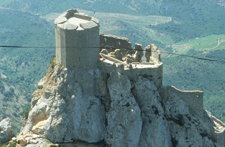 Château cathare situé à 728 mètres d'altitude. Quéribus passa entre les mains de Saint-Louis qui y fit tenir, en 1255, une garnison par vingt hommes d'armes. Il était en quelque sorte un avant-poste de Peyrepertuse et défendait le col de Maury. L'édifice est construit sur un piton, au bord d'un précipice de 60 mètres côté midi. Les bâtiments s'étagent à des niveaux différents sur la crète descendante et s'adaptent au rocher. Le donjon avait deux étages.
