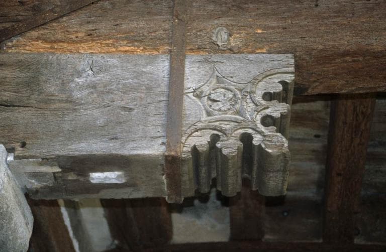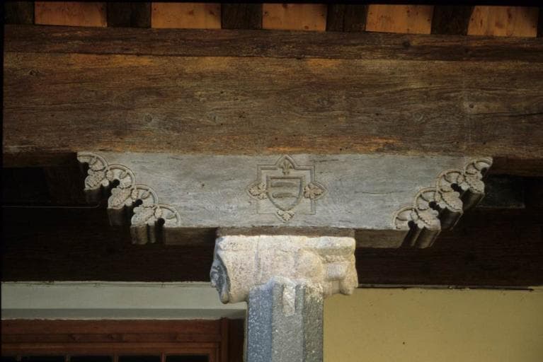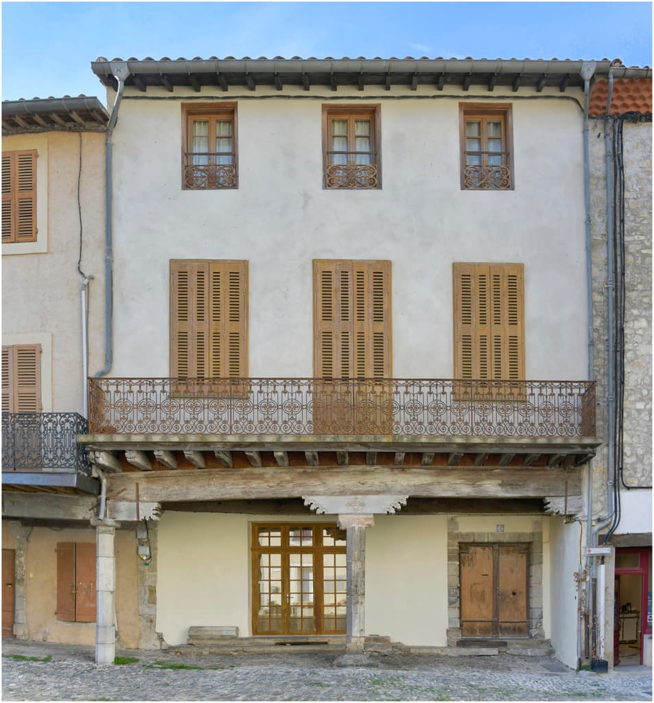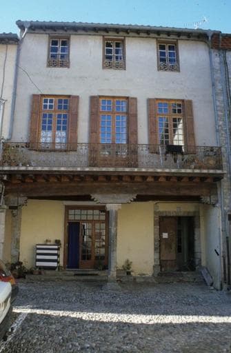 Cette maison fait partie des couverts qui subsistent sur le côté occidental de la place du Marché. Le poteau est en pierre dure, en trois morceaux. Celui du sommet porte, en guise de chapiteau, deux têtes encapuchonnées. Au-dessus est disposé un sommier en bois mouluré à triple tore qui soulage la maîtresse poutre dont les extrémités reposent sur des corbeaux en bois. Primitivement, la façade de cet immeuble devait être établie en encorbellement sur les solives moulurées aux abouts qui ne portent plus qu'un balcon. Elle devait être en pans de bois. Cet arrangement de portique peut, par la mouluration du sommier et des corbeaux et par le petit écusson engravé au centre du sommier, être daté du 14e siècle.