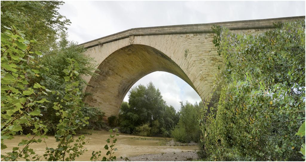 Par son faible débit d'étiage, l'Orbieu ne paraissait pas justifier un travail de cette ampleur, mais les crues subites de ce cours d'eau ayant détruit plusieurs ouvrages successifs, on décida de le franchir à une hauteur suffisante pour éliminer tout danger. L'importance du devis excédant les moyens des localités et du diocèse de Narbonne, on eut recours aux Etats de Languedoc. Un premier projet, établi en 1745, situait le pont en aval, à Villedaigne, mais faisait allonger le tracé de la route prévue de Narbonne à Lézignan. En mars 1746 fut approuvé le projet de l'ingéneiur Carney. Les premiers travaux révélèrent que le roc était moins solide qu'il ne paraissait. La pile qui devait recevoir la retombée des deux arches centrales s'affaissait. Il fallut se résoudre à remplacer les eux grandes arches prévues par trois arches. En 1752, Garipuy remplace Carney, décédé.££L'ouvrage est à cinq arches en plein cintre. La cote du sommet de l'arche centrale est à 13m, celle des arches latérales à 6, d'où une pente assez accusée pour les avenues. Toutes les arches sont en pierre d'appareil, ainsi que les murs de la partie centrale. Seuls les murs latéraux, au-dessus des petites arches, sont en moellons. Les deux piles médianes, dans le cours d'eau, présentent des éperons triangulaires en pierre d'appareil. A l'arche médiane, les clefs, à l'amont comme à l'aval, sont ornées d'un grand cartouche sculpté aux armes des Etats de Languedoc. Les claveaux des trois grandes arches sont alternativement longs et courts. Un bandeau extérieur, en boudin, court à la base du parapet.