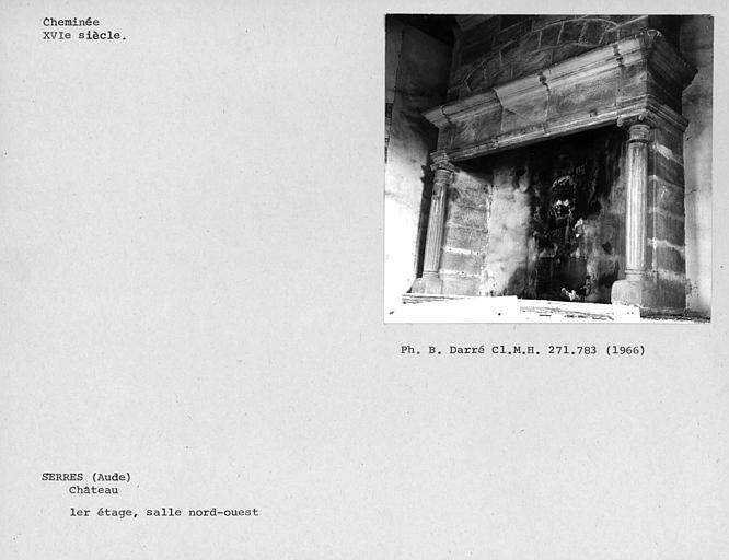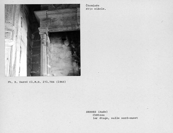 L'évêque d'Alet était le seigneur justicier de Serres et présentait à la cure, du moins aux 13e et 14e siècles. Plus tard, la seigneurie fut cédée à des particuliers. De plan à peu près carré, le château était défendu à deux angles par deux tours carrées et aux autres angles par des échauguettes en encorbellement. La tour carrée nord a conservé l'intégralité de son élévation de cinq étages. Elle est défendue, en flanquement de la courtine nord-ouest, par une canonnière rectangulaire et une embrasure à mousquet. Cette disposition et le type de la canonnière marquent le 16e siècle. La porte d'entrée était percée dans la courtine sud-est. La bretèche qui la défendait existe encore. Contre la tour carrée du nord, vers le nord-est, il existe une amorce d'arc appareillé, ancienne porte d'enceinte extérieure disparue. D'après les dispositions défensives et le tracé des moulurations des fenêtres, ces aménagements peuvent être rapportés à la fin du 16e ou au début du 17e siècle. La porte en arc et probablement le gros oeuvre des deux tours carrées et de l'échauguette ouest, doivent être antérieurs. Les reprises des murs sont visibles à plusieurs endroits, attestant l'étendue de la restauration du 16e siècle.