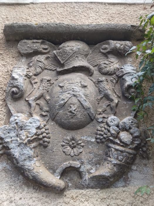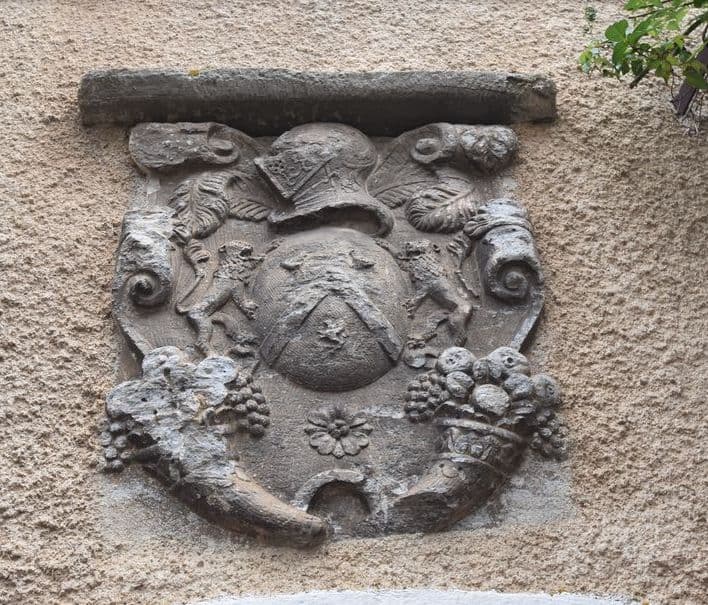 Au-dessus de la fenêtre du rez-de-chaussée est incrustée une pierre noire. Il s'agit d'un grand blason à cimier. Au centre, un écu ovale. Le blason est un chevron accompagné en chef de deux animaux indistincts et en pointe d'un lion. Le support présente deux lions affrontés. Au cimier, heaume, d'acier poli, la ventaille abaissée, lambrequin. Les bords du cartouche sont contournés et enroulés en volutes. Sous l'écu se trouve un quatrefeuilles. Plus bas, deux cornets opposés d'où s'échappent des fruits (pommes et raisins). D'après la tradition, cette pierre aurait été enlevée de la façade du château.