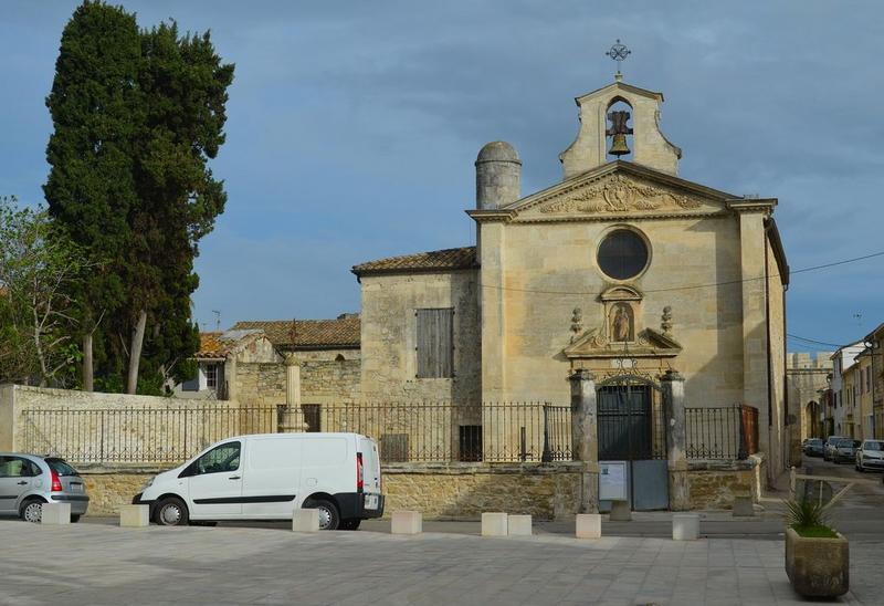 La confrérie des Pénitents gris d'Aigues-Mortes aurait été fondée au début du 15e siècle (1400 selon la tradition). Une chapelle fut élevée dès cette époque sur l'emplacement de la chapelle actuelle. Elle est détruite en 1575 lors des troubles causés par les guerres de Religion. En 1605, construction d'une nouvelle chapelle, consacrée en 1611. En 1676, dans le cadre des travaux de surélévation de la toiture, la façade occidentale est reprise. En 1699-1700, construction du corps de bâtiment abritant l'escalier et la tribune nord. En 1793, l'ensemble du mobilier est détruit, hormis le maître-autel avec son retable. En 1802, reconstruction du clocher. L'église présente un vaisseau unique plafonné avec chevet plat. Au nord, un corps de bâtiment en appentis contre le mur de l'église, comprend, au rez-de-chaussée, un couloir reliant la porte d'entrée et un escalier menant aux tribunes, à la sacristie ; à l'étage, une tribune ouvrant sur la nef par deux baies en anse de panier. Les élévations latérales sont rythmées par des pilastres corinthiens avec morceaux d'entablement prolongeant l'ordonnance du retable. Portail à encadrement de pilastres, surmonté d'un fronton brisé et d'un édicule à niche. La chapelle construite en 1611 semble avoir été un édifice plus modeste que le bâtiment actuel.