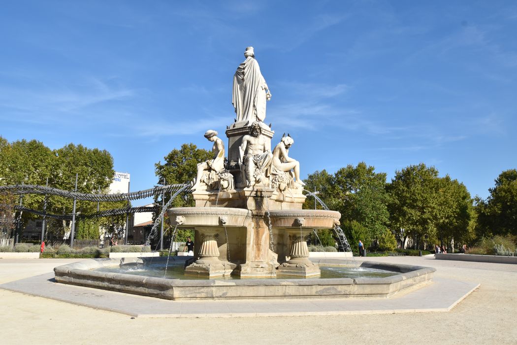 En 1840, l'arrivée du chemin de fer à Nîmes incite la municipalité à créer un monument artistique digne d'une nouvelle entrée triomphale dans le centre de la ville et à proximité du palais de justice néo-classique. Le concours lancé en 1844 pour une fontaine monumentale est remporté par Charles Questel pour le dessin. Elle sera réalisée par Pradier qui appartient à une famille protestante locale. Elle sera inaugurée en 1851. La fontaine symbolise Nîmes et les quatre sources d'approvisionnement : fontaine Nemosa, fontaine de l'Eure à Lezès, Gardon et Rhône. Les cinq figures sont réalisées en marbre blanc.