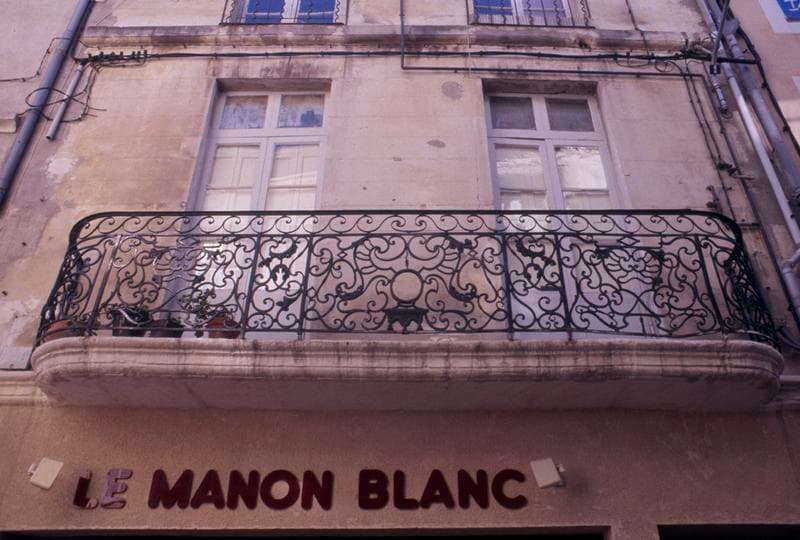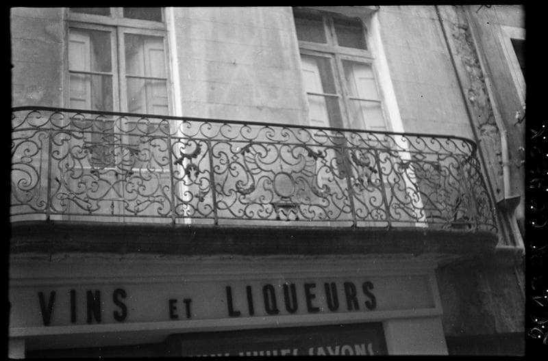 Cette maison paraît avoir appartenu au chapitre cathédral et, à ce titre, aurait peut-être été incluse dans les grandes répartitions faites en 1772, aux immeubles de la Grande-Rue dépendant du Chapitre. Au-dessus d'une devanture de boutique, occupant tout le rez-de-chaussée, chacun des étages est éclairé par deux baies. Au premier étage, ce sont des portes-fenêtres desservies par un grand balcon commun. La partie antérieure, rectiligne, de cette ferronnerie, se compose de trois panneaux séparés par des pilastres, tous limités à la partie supérieure par un encadrement relié à la main-courante par une série de volutes. Le panneau central, un peu plus long que les autres, comporte un médaillon ovale, vide, souligné par une draperie de tôle à trois glands, et entouré par un grand fleuron. Les volutes du remplage sont de types variés. Les deux panneaux latéraux sont composés de la même façon, excepté que le médaillon central y est remplacé par deux volutes croisées en x. Les panneaux des retours, cintrés en quart de cercle, se distinguent des autres par leur double encadrement, cernant un grand fleuron qui constitue le remplage.