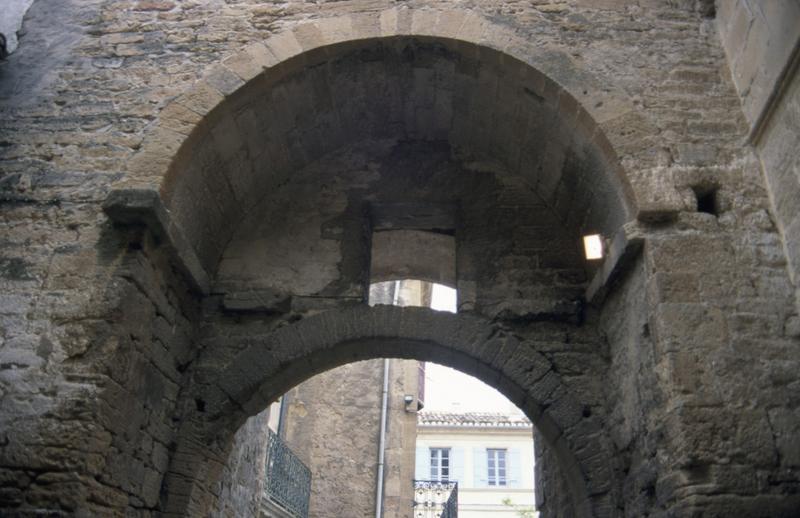 En 1356, réparation des remparts et construction de mâchicoulis. En 1590, démantèlement des remparts hormis deux tours et cette porte. Une partie de son couronnement a disparu, mais les mâchicoulis sont restés cependant presque au complet. Cette porte de six mètres de haut, surmontée d'une haute tour, est enveloppée, sur deux faces, par les constructions voisines et se relie avec la construction postérieure par deux passages voûtés sur rue.