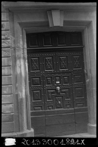 Les vantaux sont assemblés sur les traverses horizontales par des clous ronds, alignés horizontalement. Les deux grands vantaux latéraux, en forme d'équerre, se composent chacun d'une rangée verticale de quatre petits panneaux carrés ou rectangulaires, de hauteurs inégales. Un clou rond marque le centre de chaque panneau. Le vantail piéton comprend, suivant le type habituel à Uzès, un petit panneau central relié à la traverse horizontale correspondante par un encadrement à rainure. Les écoinçons sont occupés par des panneaux en équerre, fixés par deux clous ronds. Le panneau médian, de même que les grands panneaux supérieurs, est décoré d'un quadrillage oblique, de rainures parallèles. Partie inférieure refaite.