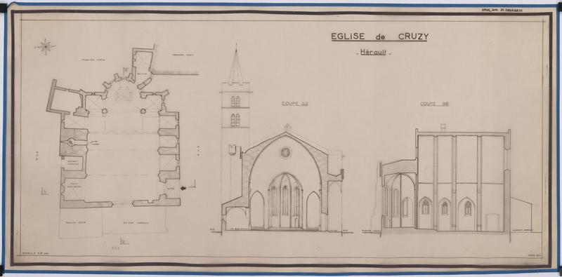 L'église présente une variante assez rare au type régional très répandu des églises du 14e siècle. Par la disposition du choeur et des deux absidioles, Cruzy rappelle les églises Saint-Michel et Saint-Vincent de Carcassonne. Tandis que ces églises sont couvertes d'une voûte ordinaire avec arcs diagonaux ou par une simple charpente, celle-ci est couverte par un grand berceau renforcé par les arcs doubleaux. Ce berceau a 18,60m de portée et indique une certaine audace chez son constructeur. Au premier abord, l'église semble avoir été bâtie d'un seul jet pour la nef et le choeur, mais les joints des colonnes prismatiques engagées dans les murs latéraux concordent rarement avec ceux de l'appareil de ces murs. On peut se demander si l'on n'est pas en présence d'un berceau roman renforcé de doubleaux au 14e siècle. Les trois chapelles du midi ont été agencées au 15e siècle entre les contreforts. La porte remonte à la même époque, ainsi que la défense supérieure à mâchicoulis qui forme porche. Les échauguettes posées en encorbellement aux angles de la façade ouest et sur tous les contreforts à la suite, datent du 14e siècle. Le clocher est plus tardif.