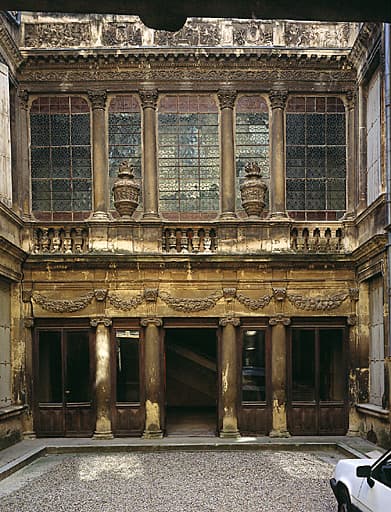 La façade sur cour intérieure comprend un rez-de-chaussée d'ordre ionique, un premier étage corinthien avec balustrade à balustres carrés et pots à feu entre les colonnes jumelées. Au-dessus du premier étage, attique avec panneaux décorés comprenant autrefois des bustes. L'escalier, édifié vers 1650-1670, est en pierre et les paliers d'angle reposent sur des trompes appareillées.