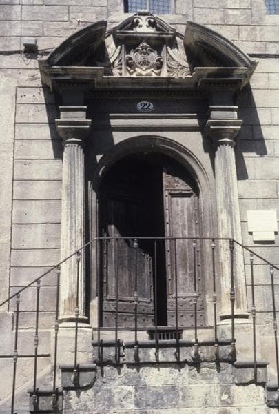 Porte en pierre, à colonnes cannelées doriques, avec entablement et fronton coupé. Ordonnance commune au 17e siècle.