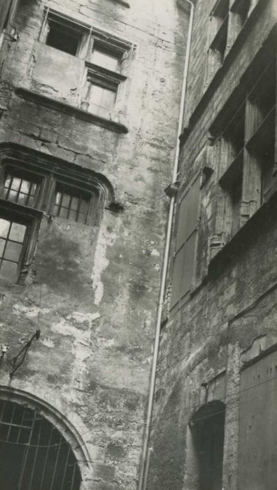Façade sur rue présentant une ordonnance architecturale Renaissance. La cour est encadrée par quatre façades percées de fenêtres Renaissance et ornées de médaillons également Renaissance sur l'une d'elles. Le fond de la cour s'ouvre, au rez-de-chaussée, sur une galerie gothique dont une travée présente les caractéristiques du 15e siècle. Cette travée appartenait à une ordonnance plus importante dont les amorces de croisées d'ogives sont nettement visibles.