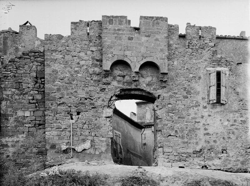 La porte fortifiée qui donnait accès au château, se situe au sommet du village et fait face au sud. Elle est surmontée de meurtrières et de mâchicoulis dont l'accès se fait par de petits escaliers encastrés à droite et à gauche, dans l'épaisseur des murs. Les remparts, très épais et très hauts, entouraient autrefois la partie la plus élevée du village, notamment l'église paroissiale et le cloître lui faisant suite. Ces remparts ont été en partie détruits.