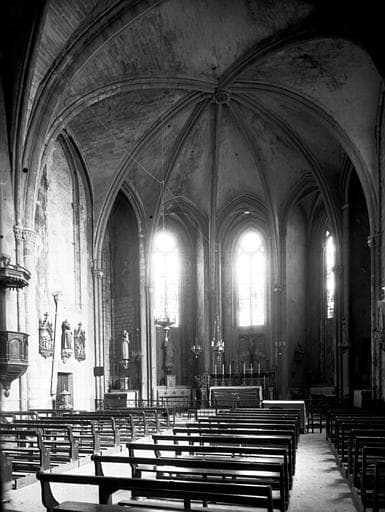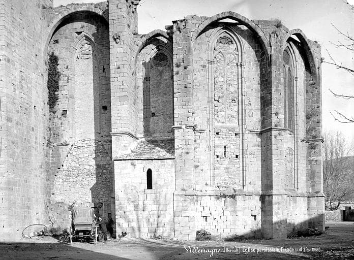 Les moines de l'abbaye ont reconstruit leur église au cours du 14e siècle mais l'édifice est resté inachevé : un simple mur forme la façade. Le chevet est formé de cinq chapelles dont les voûtes montent à la même hauteur que les formerets des grandes voûtes. Le choeur lui-même est éclairé par les fenêtres à meneaux de ces chapelles. Les nervures retombent sur des colonnettes dont les chapiteaux sont ornés de figures humaines ou animales. Le clocher est roman sur presque toute sa hauteur. Il est le seul reste de l'église de l'abbaye primitive. A l'extérieur, une série de grands arcs formant mâchicoulis, reliait les sommets des contreforts. Les moines avaient adopté, pour fortifier leur église, un système se rapprochant de celui de Saint-Nazaire à Béziers. Le parapet était crénelé. Le pavé de l'église est très relevé au-dessus du sol du village, à cause des inondations du torrent de la Mare qui ont causé, autrefois, la ruine de l'église Saint-Grégoire. A la Révolution, l'église fut transformée en verrerie et eut à souffrir de cette utilisation.