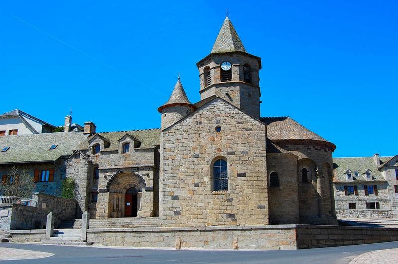Eglise romane en forme de croix latine dont le plan se compose d'une nef, d'une abside en hémicycle, d'un transept débordant avec deux absidioles, deux chapelles voûtées d'arêtes constituant un collatéral nord. L'abside semi-circulaire est voûtée en cul de four. La croisée du transept est voûtée d'une coupole sur trompe ; des colonnes romanes engagées soutiennent les quatre arcs en plein-cintre du carré du transept. Le portail est orné de voussures en plein cintre. Un clocher octogonal s'élève sur la croisée du transept et se termine par une flèche. En 1074, l'église était donnée à l'abbaye Saint-Victor puis, la dômerie d'Aubrac la comprit dans ses domaines.