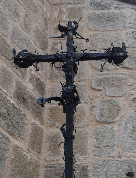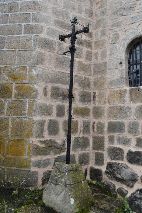 Croix en fer forgé à quatre rangs d'arcs épineux. Trois tenons étaient destinés à recevoir des lanternes. Des tigelles à anneaux émergent des feuilles et devaient recevoir des chaînes qui réunissaient les bras. Le Christ et la Vierge sont abrités sous un auvent en forme d'abat-voix. Une inscription gothique occupe le pied de la croix et son dernier tiers.
