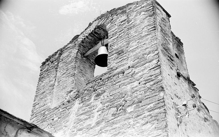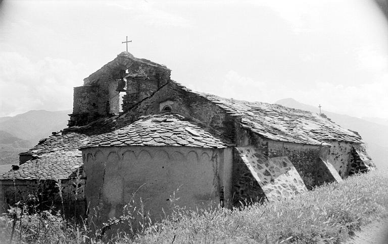 L'église est mentionnée en 1277. L'édifice se compose d'une nef unique, prolongée à l'est par une abside demi-circulaire, et s'appuyant au sud contre un clocher carré qui semble avoir été arasé à un niveau très inférieur à celui d'origine. Ce clocher a été doté d'une arcade campanaire qui pourrait représenter l'une des faces du clocher primitif. Le clocher appartient à la même campagne de construction que la nef et l'abside, bien que l'adjonction d'une église à une tour-signal plus ancienne ne soit pas à exclure. L'abside est décorée d'une arcature lombarde continue, s'appuyant aux deux extrémités sur des contreforts plats. Au-devant de la nef au sud, a été édifié un porche prolongeant l'alignement du clocher et formant une sorte de collatéral. Cette construction est ancienne, comportant une porte romane en plein cintre, à double rouleau, encore munie de ses vantaux à ferrures de type catalan. Le mur latéral nord a subi des mouvements ayant obligé, en 1951 et 1960, à construire trois contreforts talutés.