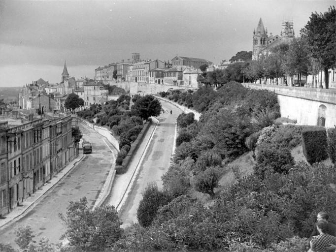 La première enceinte établie sur la crête rocheuse est encore visible au nord, près du marché couvert, situé à l'emplacement même qu'occupait l'ancien château qui protégeait la ville. Partant de ce point, le rempart suivait la falaise vers l'ouest puis se retournait au sud. Le mur de ce rempart fut construit par assises de pierre de taille, de grandes dimensions, posées à joints vifs sans mortier. Ce rempart était constitué par deux parements formant pratiquement deux murs entre lesquels avaient été entassés des débris de pierres moulurées, de fûts de colonnes, de bas-reliefs, de chapiteaux et de statues provenant de la destruction de constructions antérieures. Le parement de cette première enceinte, qui pourrait remonter au 4e siècle, laisse apparaître, à la partie supérieure des pierres, les trous ayant servi à les monter et à les mettre en place. Il subsiste en outre les restes de deux tours carrées, situées près de l'entrée du jardin public, sans doute bâties au 11e siècle pour flanquer la courtine. Au pied du marché couvert se trouvent également, dérasées, trois tours demi-cylindriques qui protégeaient les abords du château primitif. Cette première enceinte fut complétée, à la fin du 12e siècle, par une suite de remparts disposés pour envelopper le château neuf et défendre la partie orientale de la ville. Les parties subsistantes de ce dispositif laissent voir les restes de trois tours demi-cylindriques qui flanquaient ce rempart. A la fin du 13e siècle, l'importance du faubourg Saint-Martial fut jugée assez grande pour justifier sa protection. On construisit une suite de courtines et de tours demi-cylindriques qui englobaient, dans leur tracé, le champs de Mars actuel pour rejoindre l'emplacement de l'ancien château. Cette enceinte a disparu presque complètement, hormis quelques restes de courtines et de tours percées de meutrières à canons.
