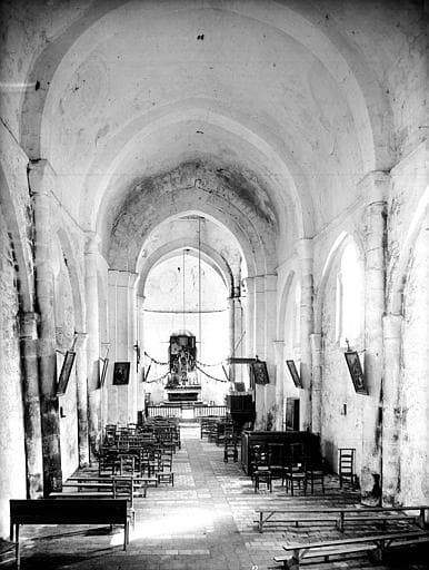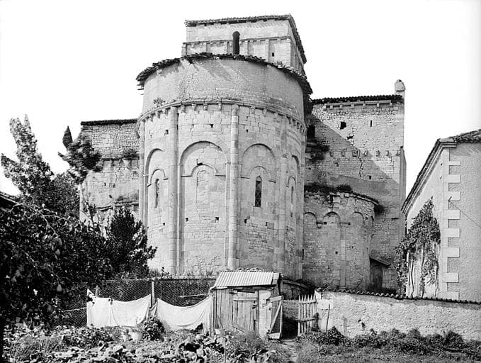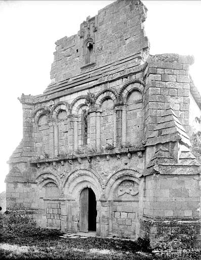 Edifice du 12e siècle, composé d'une nef avec transept, abside et absidioles. Il est surmonté d'un clocher carré. Toute la partie supérieure de la façade principale (ouest) forme pignon et a été remontée au 14e siècle, ainsi que les contreforts d'angle. La partie inférieure, du 12e siècle, est composée d'un portail à archivolte décorée, flanqué de deux arcatures aveugles dont les archivoltes sont également ornées, de même que le tympan de l'arcature droite. Au-dessus du portail règne une série d'arcatures aveugles.
