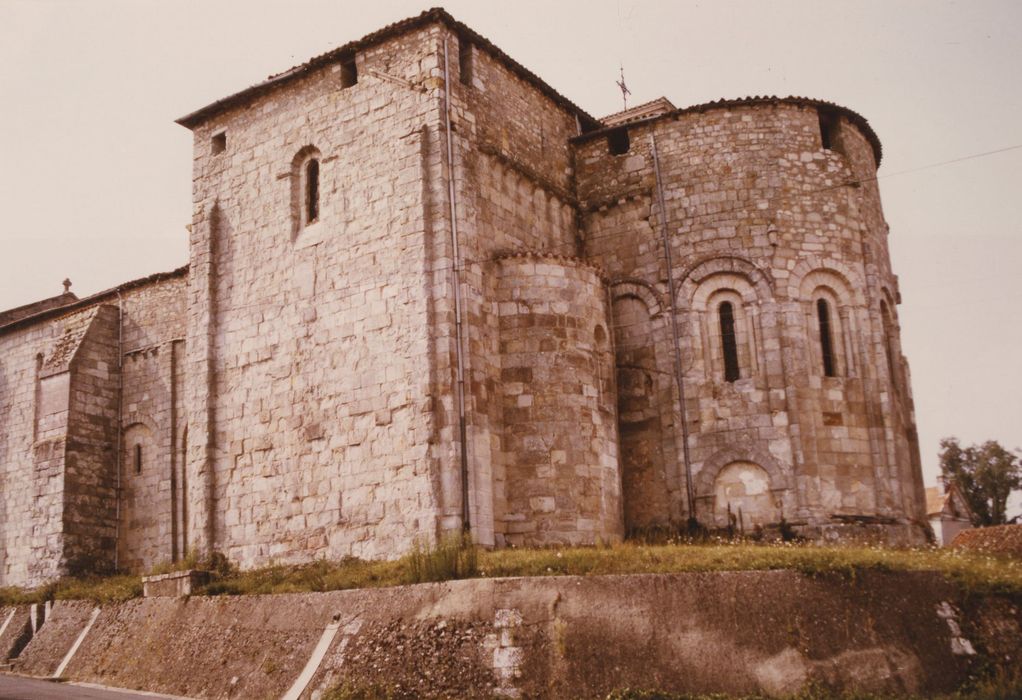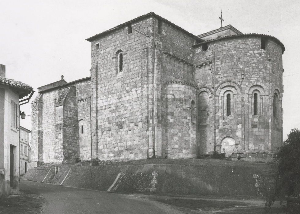 Eglise de style roman du 12e siècle à l'origine, elle a subi de graves dommages pendant la guerre de Cent ans. Si le clocher roman était à la croisée, il a dû, dès cette période, être reconstruit sur le bras nord du transept. D'ancien, il ne reste plus que la base. Dans un but de fortification, le chevet et les bras du transept ont été surhaussés et des ouvertures rectangulaires sans linteaux permettaient de faire le guet. La façade et la première travée de la nef semblent avoir été totalement remontées à la fin du Moyen Age. Le portail occidental pourrait être daté de la seconde moitié du 15e siècle. Le plan d'origine comporte une nef à une travée, un transept avec absidiole sur chaque bras et un chevet à abside ronde. L'absidiole nord a disparu et a été remplacée par une sacristie. L'abside circulaire du chevet est ornée de sept grandes arcades dans lesquelles s'inscrivent des baies encadrées de colonnettes à chapiteaux sculptés. Les travées romanes occidentales de la nef ont été remontées à la fin du Moyen Age, de même que la façade occidentale, prolongée d'un fronton triangulaire après 1880. Des vitraux dus à Dagrant de Bordeaux, posés entre 1891 et 1902, éclairent l'ensemble.