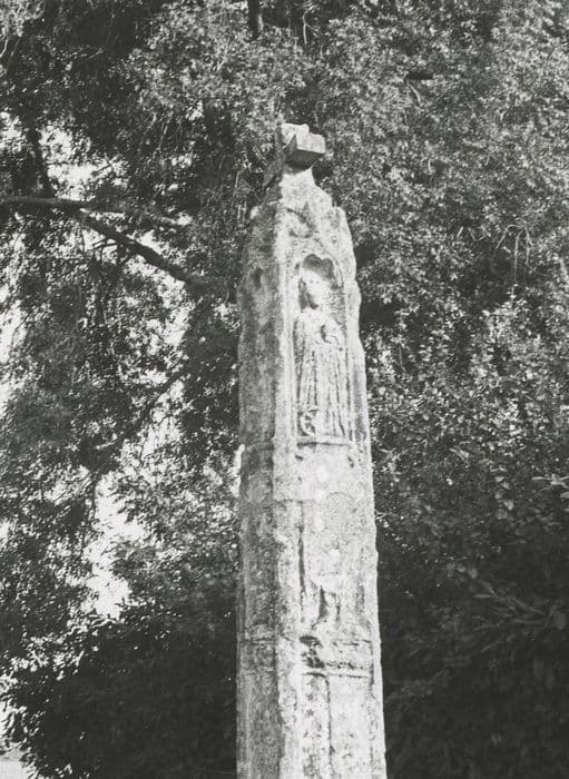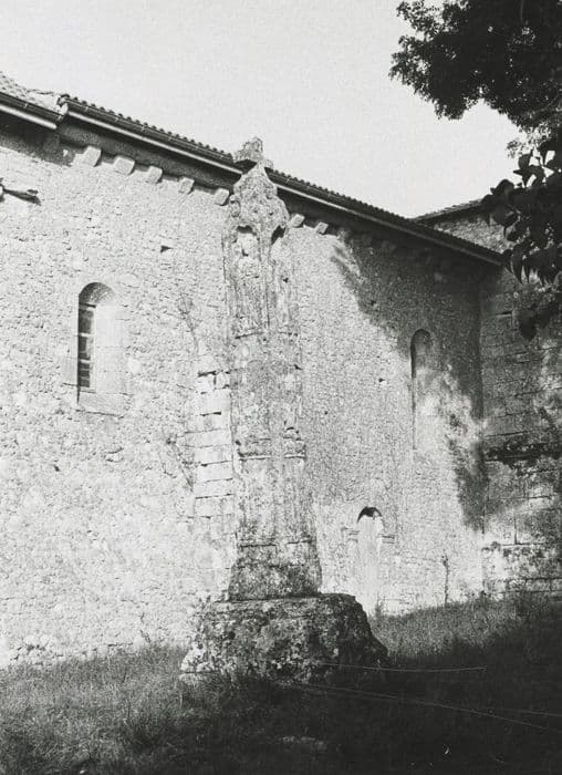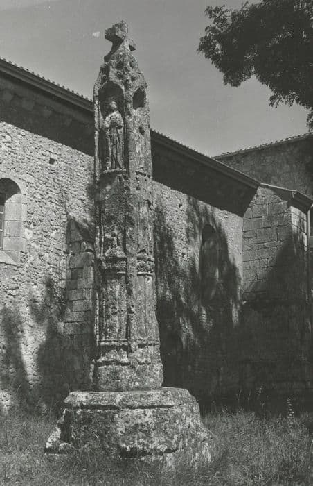 L'ouvrage est peut-être daté du Moyen Age. L'église a également reçu d'importantes modifications gothiques. Aucune partie de la croix n'est laissée sans décor sculpté. Le socle est orné de moulures. Au sommet, la croix a été rajoutée tardivement. Le fût de colonne est composé, verticalement, de quatre faces délimitées par des colonnettes ininterrompues se terminant par un pinacle. Trois niveaux horizontaux sont soulignés par de grosses moulures dont l'une est sculptée de feuillages. Au premier niveau, le décor est constitué de larges bandes suggérant des cannelures. Au-dessus, quatre personnages en robes d'ecclésiastiques ont perdu bustes et têtes. Au dernier niveau, les sculptures sont plus lisibles. Quatre personnages sont sculptés en ronde bosse dans un effet de niches, en arc trilobé, surmontés d'un gâble flamboyant.