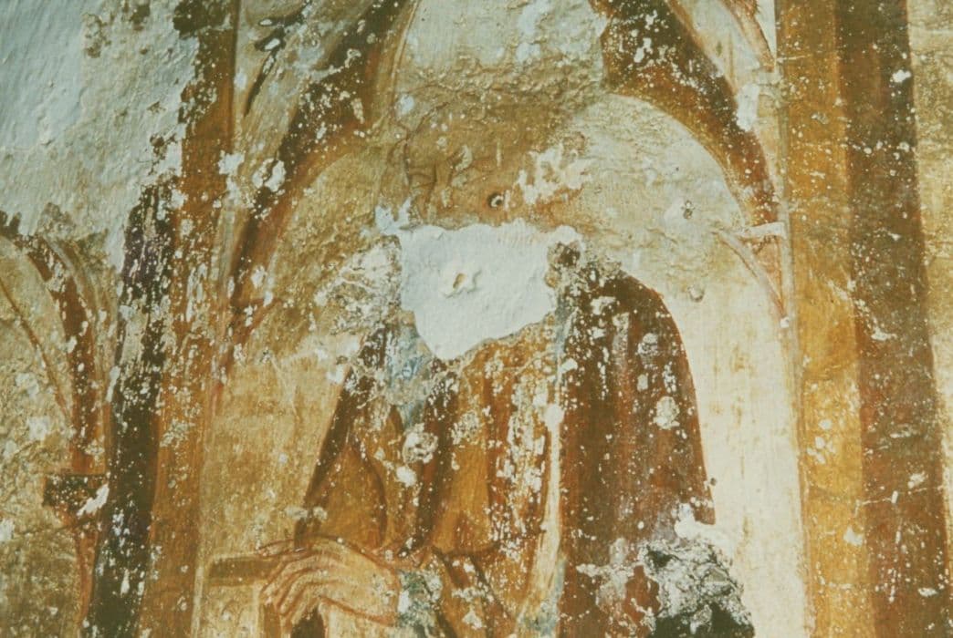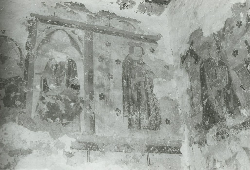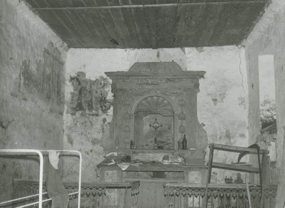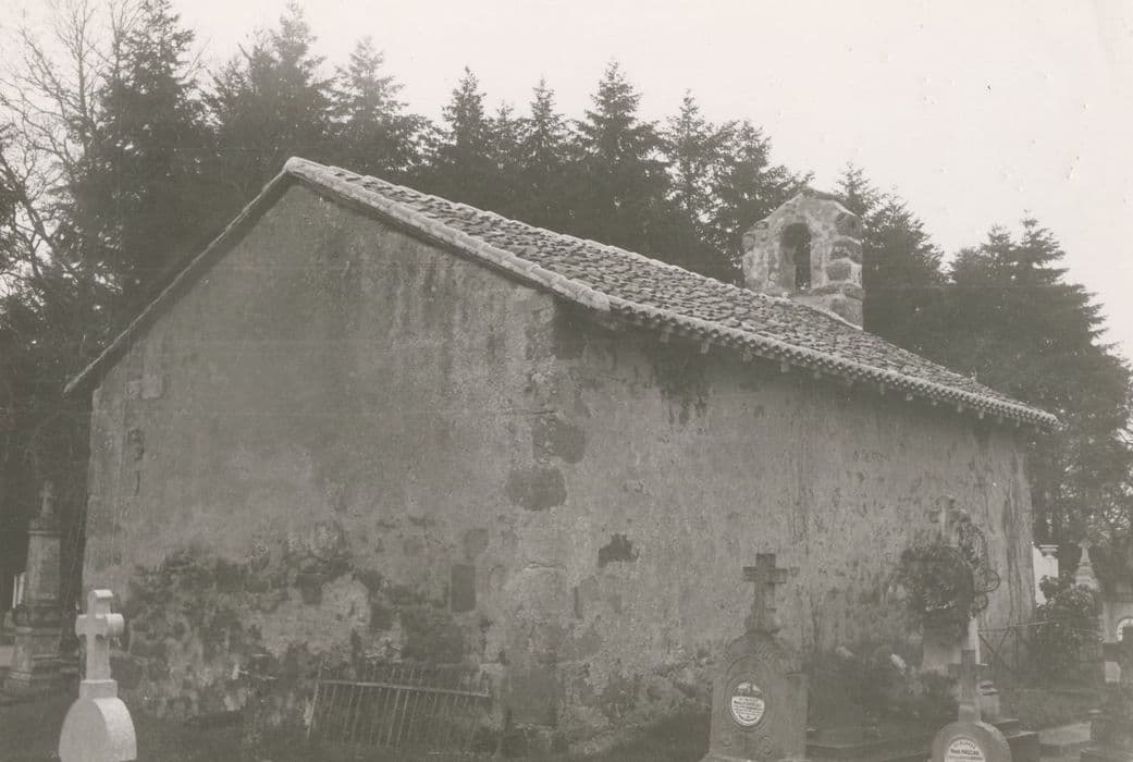 Petite chapelle cimetériale de plan rectangulaire, à chevet plat, ouverte à l'ouest par une porte en plein cintre surmontée, au-dessus du mur pignon, d'un clocher en batière typique des églises rurales de faible volume. A l'intérieur, l'église est parcourue au sommet de ses murs longitudinaux par une corniche recevant un plafond de lattes de bois. Une partie des fresques a été mise au jour au nord et à l'est. Ces fresques s'organisent sur deux registres horizontaux surmontés d'une frise de rinceaux et séparés par une double bande ocre rouge et jaune. Ce cadre surajouté à l'architecture se divise également en tableaux délimités verticalement par un système de bandes identiques. La troisième couleur fondamentale est le vert. Trois scènes du registre supérieur sont déchiffrables. Elles ont pour sujet l'iconographie du Nouveau Testament et plus particulièrement la Nativité et l'enfance du Christ.
