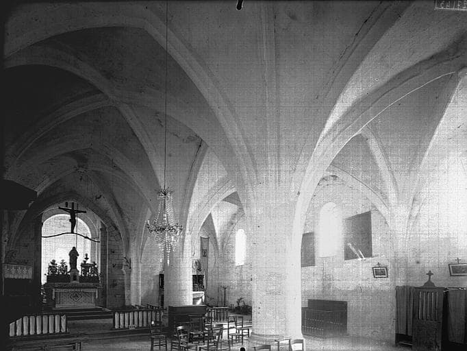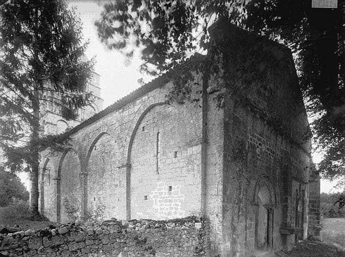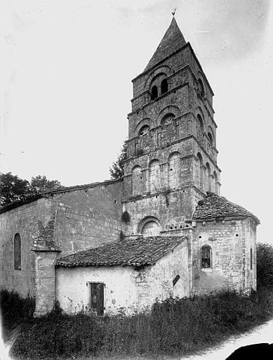 Edifice du 12e siècle, agrandi au 15e siècle d'une seconde nef de même dimension. L'église romane comporte, à l'est, un choeur demi-circulaire, voûté en cul de four, relié à la nef par un carré voûté en coupole par une calotte reposant sur des trompes. Au-dessus de cette coupole s'élève le clocher qui se compose de trois étages dont les deux supérieurs sont ajourés par des arcatures et l'étage inférieur orné d'arcades aveugles. Les arcatures du deuxième étage ont été maçonnées au 18e siècle. Primitivement, la nef romane était voûtée par un berceau plein cintre, voûte démolie au 15e siècle pour être remplacée par des arcs d'ogives. Le mur sud est percé de baies tandis que celui du nord ne comporte qu'une meurtrière. A l'extérieur, le chevet est polygonal. Le mur nord extérieur est renforcé par des arcatures en arcs brisés reliant les contreforts, suivant la technique utilisée dans la région au début du 12e siècle.
