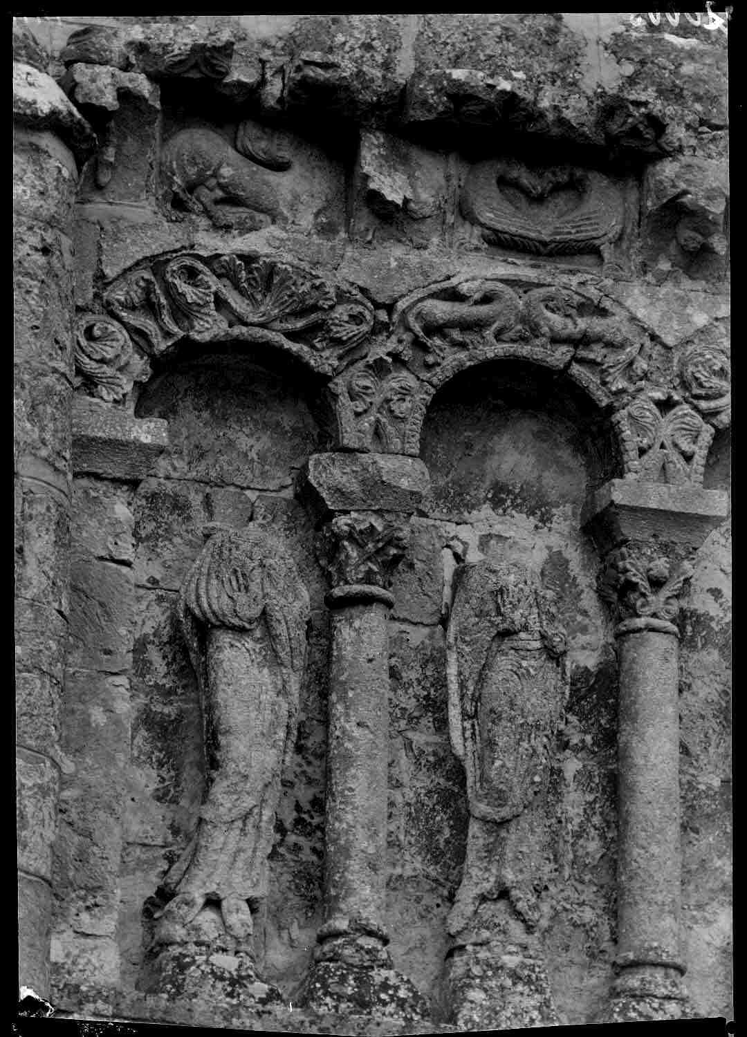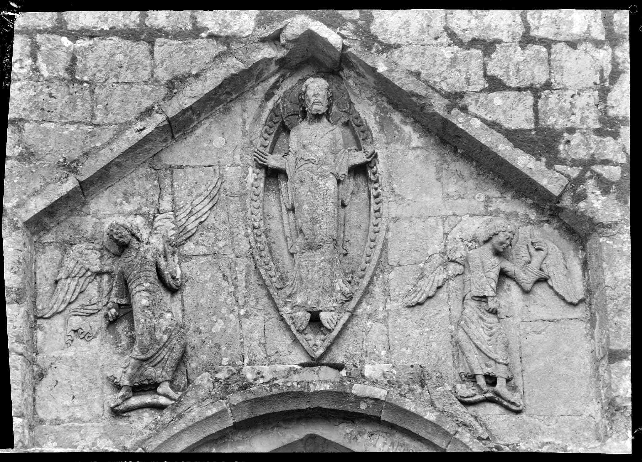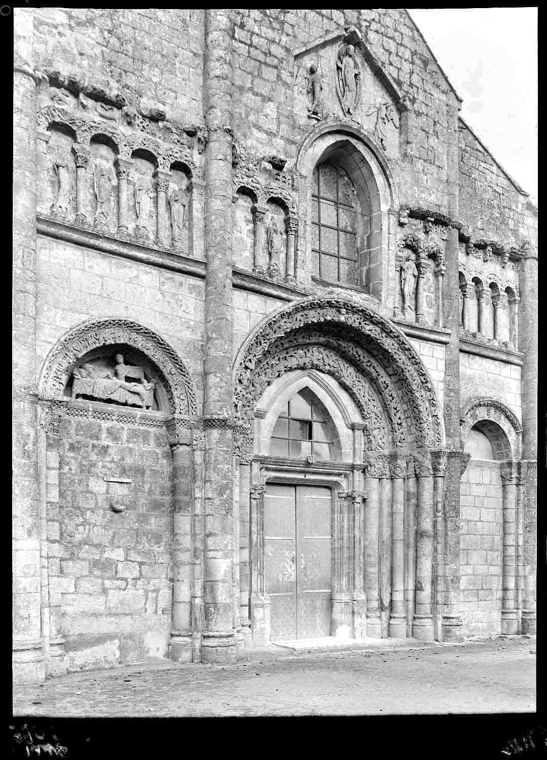 La façade s'ouvre par un portail composé de trois archivoltes aux contours sculptés. De chaque côté de ce portail, et séparé par un pilastre cylindrique montant jusqu'au sommet de la façade, se trouve une arcade plein cintre aux contours sculptés, avec tympan uni et en arrière formant niche. Dans la niche de droite, le motif sculpté a disparu. Dans la niche de gauche, est représenté un lit richement orné sur lequl repose un être humain avec, sur le pied du lit, un quadrupède qu paraît avoir une tête humaine. Au milieu et au-dessus des archivoltes du grand portail, se trouve une fenêtre de grande dimension. De chaque côté de cette fenêtre, une galerie se compose de six niches plein cintre sculptées et moulurées. Ces niches ont pour la plupart conservé leurs statues (douze apôtres). Le tout est encadré par deux autres pilastres cylindriques qui s'élèvent également jusqu'au sommet de l'édifice. Dans le pignon, au sommet de la façade, un médaillon représente le Christ debout avec, de chaque côté, deux anges debout.