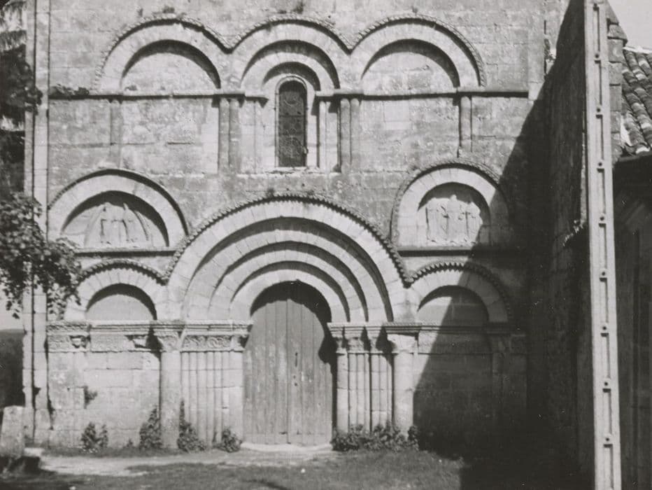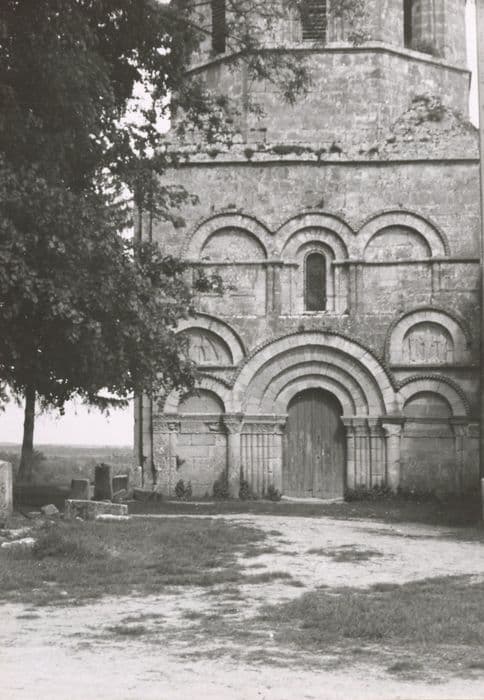 Eglise signalée dès 1110. Elle fut remaniée au 15e siècle et reçut des voûtes d'ogives. Restauration en 1870. La nef est précédée d'une travée portant le clocher, au-dessus d'une coupole ovale sur pendentifs. La nef est couverte de voûtes d'ogives avec doubleaux sur colonnes, formerets et liernes. Le choeur est plus étroit que la nef, à chevet droit. A l'ouest du clocher est plaquée la façade de la fin du 12e siècle, à trois étages. La porte d'entrée occidentale est à quatre voussures, sur colonnes aux tailloirs à multiples voussures s'étendant en frise. Chapiteaux sculptés. Un cordon de pointes de diamant entoure le tout. Au-dessus, deux arcs sont portés par un cordon à dents de scie, renfermant deux tympans remployés, représentant un saint personnage offrant une couronne à un évêque pour l'un ; le Christ bénissant entre la Vierge et saint Jean pour l'autre. Le dernier étage est décoré de trois arcades, celle du milieu étant ajourée d'une fenêtre. Elles sont entourées de dents de scie sur colonnettes.