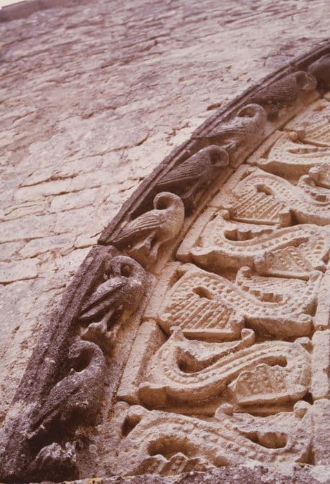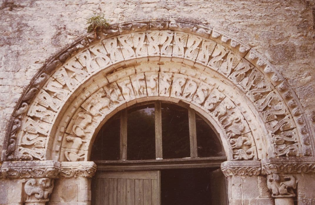 De l'église primitive de la fin du 11e siècle, il ne resterait que la partie inférieure de la façade, le chevet et, à l'intérieur, les chapiteaux à l'entrée du choeur. L'empreinte de la fin du Moyen Age apparaît au clocher massif, aménagé aux 14e puis 16e siècles en corps de garde et qui servit de forteresse. L'église romane a peut-être été victime des guerres de Cent ans et de Religion. La voûte en pierre a disparu. Les murs latéraux et la partie supérieure de la façade ouest sembleraient avoir été édifiés au début du 17e siècle. Les différences d'appareillage laissent voir ces remaniements. Le plan de l'église est simple et a dû rester, dans l'ensemble, fidèle au plan initial : une seule nef, une abside circulaire, le clocher à la jonction, entre la nef et l'abside. Le portail occidental offre une grande variété de thèmes iconographiques. Une seule colonne figure à chaque piédroit du portail. Elle est surmontée de chapiteaux sculptés d'animaux mythiques. Au cordon d'archivolte apparaît un programme divers. La voussure externe présente une succession de S à l'endroit et à l'envers, ornés de fines perles, se réunissant en haut et en bas en une palme de feuillage. La voussure interne porte des sphinx à tête barbue, des équidés, des dragons et des sortes de basilics. Le clocher massif a été fortifié à la fin du Moyen Age. A l'intérieur, la nef ayant perdu sa voûte, a été recouverte d'un lambris en berceau surbaissé.