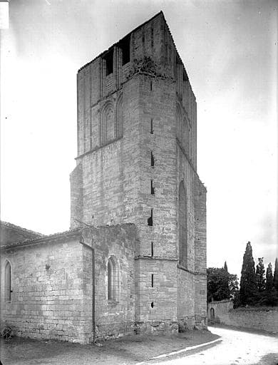 A l'origine, l'église avait deux nefs, l'une, la seule existante, étant attribuée aux religieux. La façade romane est marquée par le style du 12e siècle. La porte est encadrée de quatre voussures sans ornements, supportées de chaque côté par autant de colonnes surmontées de chapiteaux et d'une archivolte d'entrelacs. Un rang de corbeaux la sépare de trois arcades avec chapiteaux. A gauche de cette façade se trouve le clocher carré, de style 13e ou début du 14e siècle. Il n'a jamais été achevé et s'élève à peu près aux deux tiers de la hauteur qu'il aurait dû avoir. La porte s'ouvrant à sa base permettait aux fidèles d'entrer dans leur nef, aujourd'hui détruite. Au-dessus de cette porte se trouve, sur deux faces, une grande fenêtre avec trumeau central.