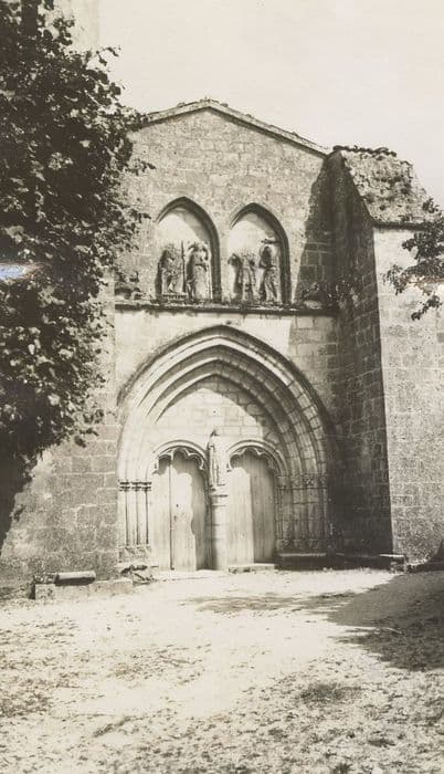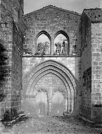 Eglise à deux nefs. Celle du nord est composée d'une abside du 12e siècle jusqu'au droit des amorces d'un transept disparu, le mur nord et les piliers ayant été reconstruits au 18e siècle, le mur ouest s'alignant avec l'entrée reconstruite à la fin du 14e siècle et formant la nef du sud. D'anciennes bases de la façade du 12e siècle subsistent à l'angle nord de cette façade. La nef du sud comprend trois parties. Vers l'est, une partie construite au 13e siècle, comprenant deux travées. Puis une partie de deux travées datant du 14e siècle. Enfin, la travée de la façade, construite dans une seconde campagne à la fin du 14e siècle. Du 12e siècle, l'abside de la nef nord conserve des fenêtres à double ébrasement, à colonnettes et arcade décorée, bandeaux à damier et pointes de diamant, chapiteaux à feuillages et animaux entrelacés. Les fenêtres géminées du mur est de la chapelle haute de la crypte, présentent des colonnettes qui ne descendent pas jusqu'au bas des fenêtres, ces colonnettes disparaissant aux fenêtres de la première campagne de prolongement du 14e siècle. Les voûtes ont disparu dans la partie datée du 14e siècle et les parties hautes ont subi un début de dérasement, vraisemblablement à l'époque des guerres de Religion (vers 1562). La façade ouest s'ouvre par un portail dont les deux portes, ornées d'arcs à redents, sont encadrées de trois arcs superposés reposant sur des colonnettes. Au-dessus, deux baies géminées sont ornées du martyre de saint Symphorien encadré, au-dessus du bandeau horizontal soutenant l'ensemble, par le Sagittaire et sa victime. En retour, sur le contrefort nord-ouest, le fabliau du renard et de la Cigogne est présenté en deux scènes juxtaposées dans le même panneau. En retour également, sur le contrefort sud-ouest, deux scènes sculptées à part sur une pierre rapportée dans le parement, peuvent provenir de l'ancienne église du 12e siècle.